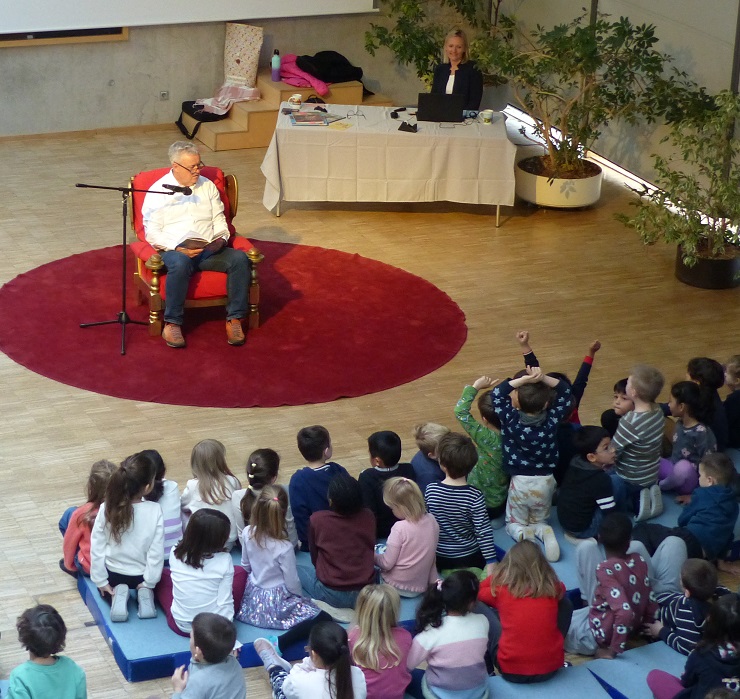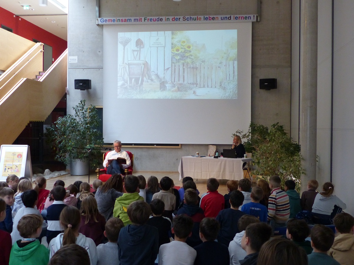 Frau Wolf von der Gemeindebücherei und Herr Körner, unser 2. Bürgermeister, kamen heute, um allen Kindern der GS Unterbiberg vorzulesen.