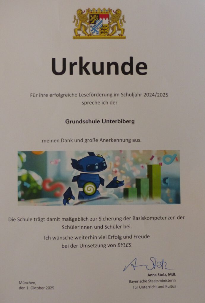 Alle fleißigen Lesekinder können auf diese Auszeichnung stolz sein. Die Urkunde bestätigt, dass sich die Leseförderung an unserer Schule bewährt und wir alle machen mit viel Engagement und Freude weiter!